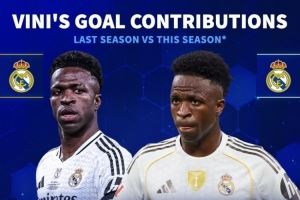 稍有下滑!维尼修斯上赛季112分钟参与1球,本赛季126分钟参与1球